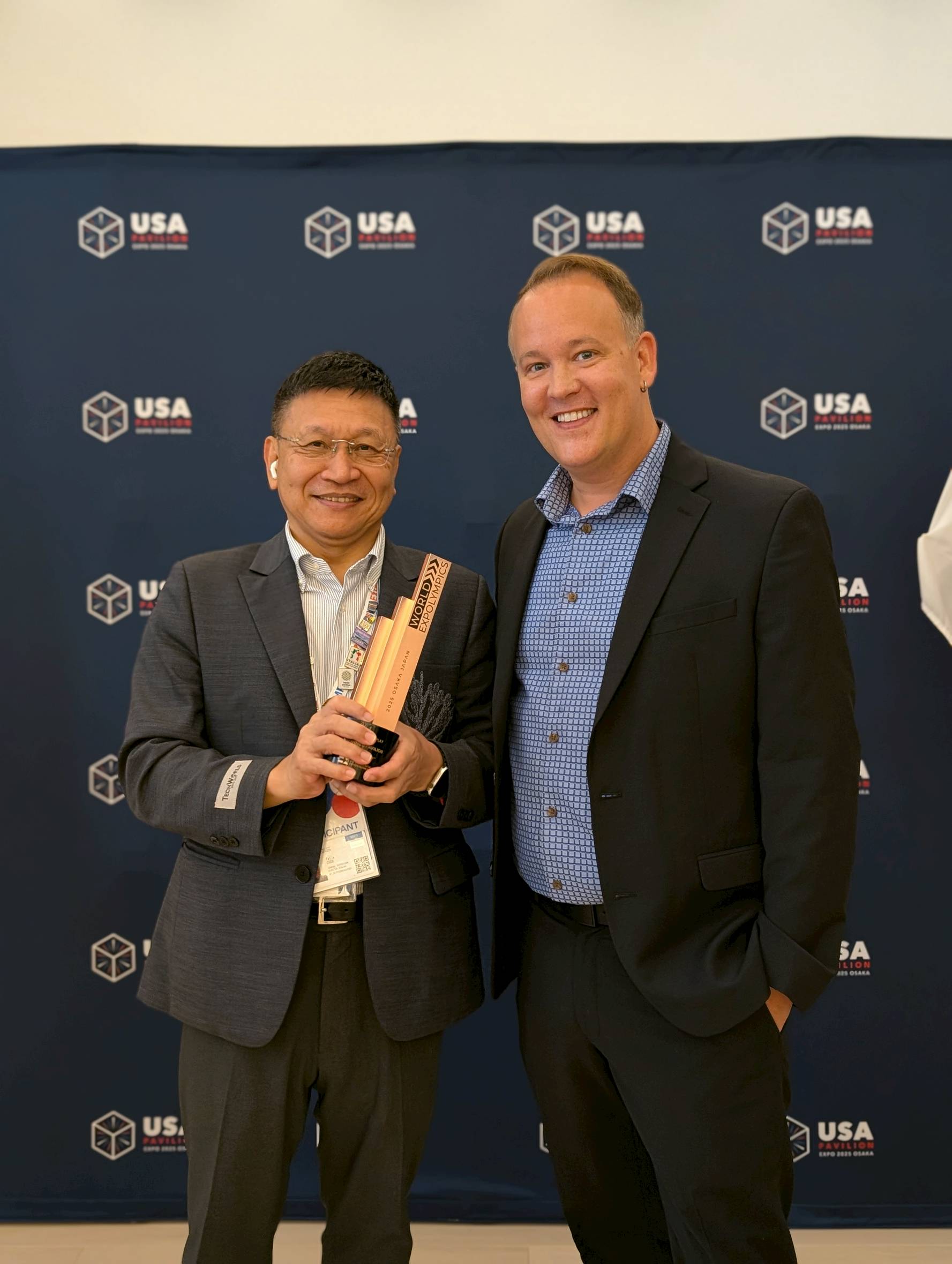 2025年大阪・関西万博において、TECH WORLDパビリオンは革新的なパフォーマンスとインタラクティブデザインで国際的に高い評価を受け、ワールド・エキスポリンピックの主要4部門に選出されました。9月23日アメリカパビリオン(USA Pavilion)で開催された授賞式ではTECH WORLDパビリオンの「ライフ劇場」が「最優秀展覧もしくはディスプレイ賞(Best Exhibit or Display)」を獲得致しました。パビリオンを代表して、館長の邱揮立氏が表彰台に上がり受賞致しました。
